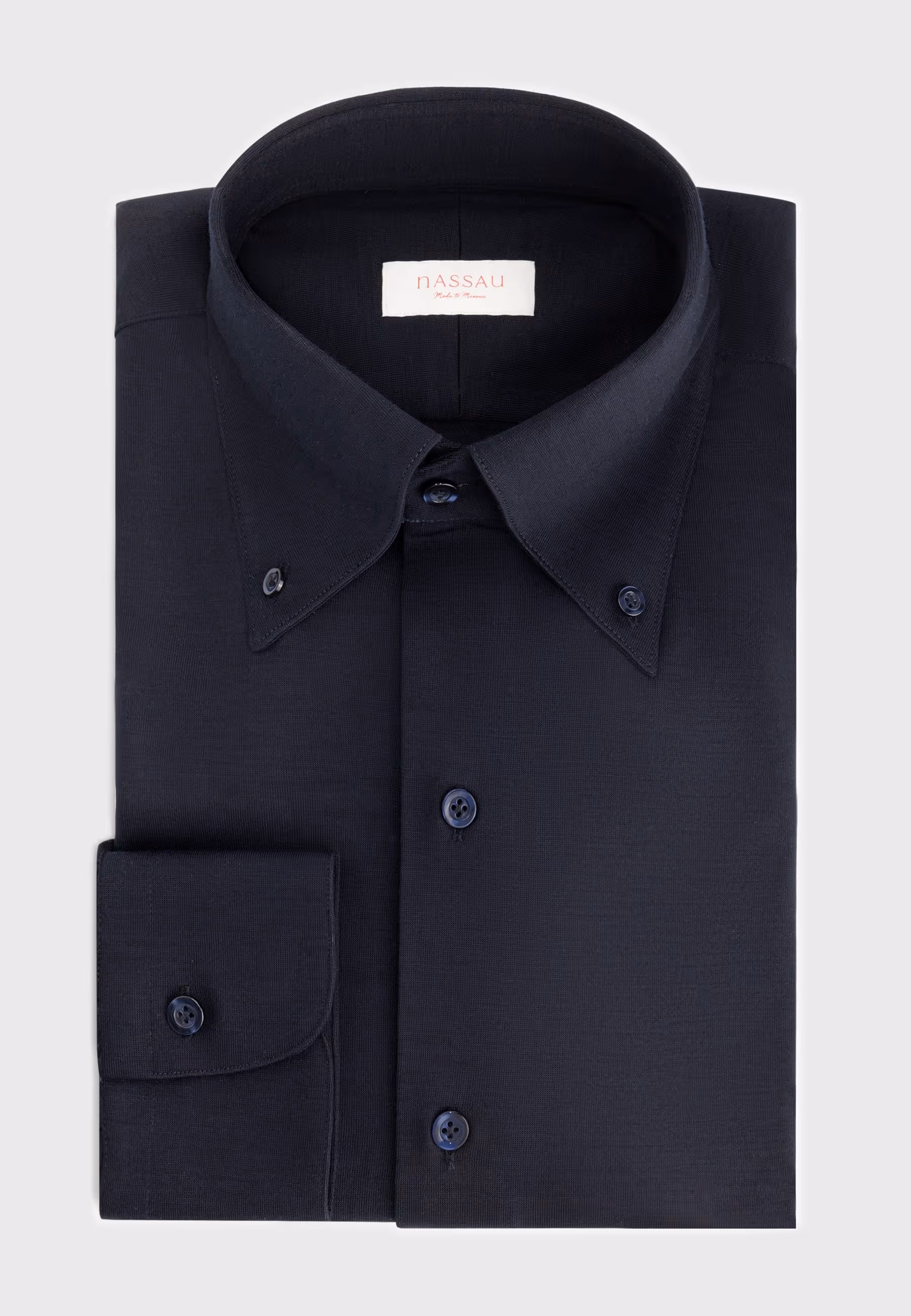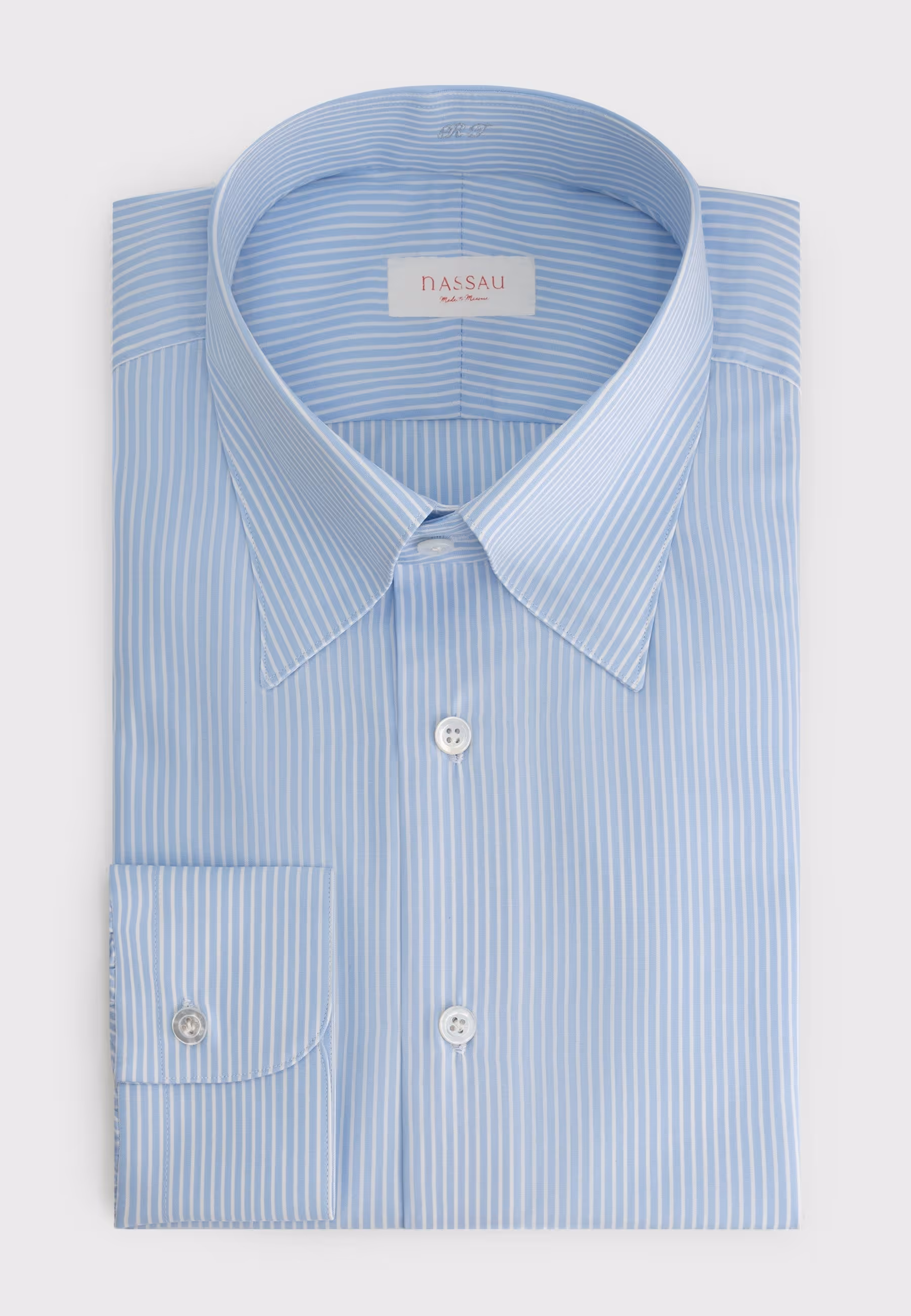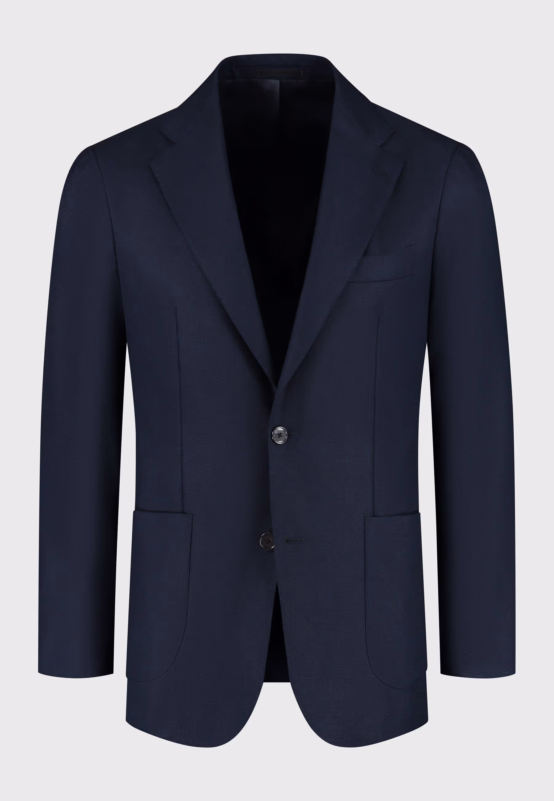 Light blue jacket made in a Loro Piana 'Cashpima' fabric in cashmere, cotton and silk. Combined with a navy wool shirt and white cotton-linen trousers. Shoes are our new penny loafers in dark brown suède.