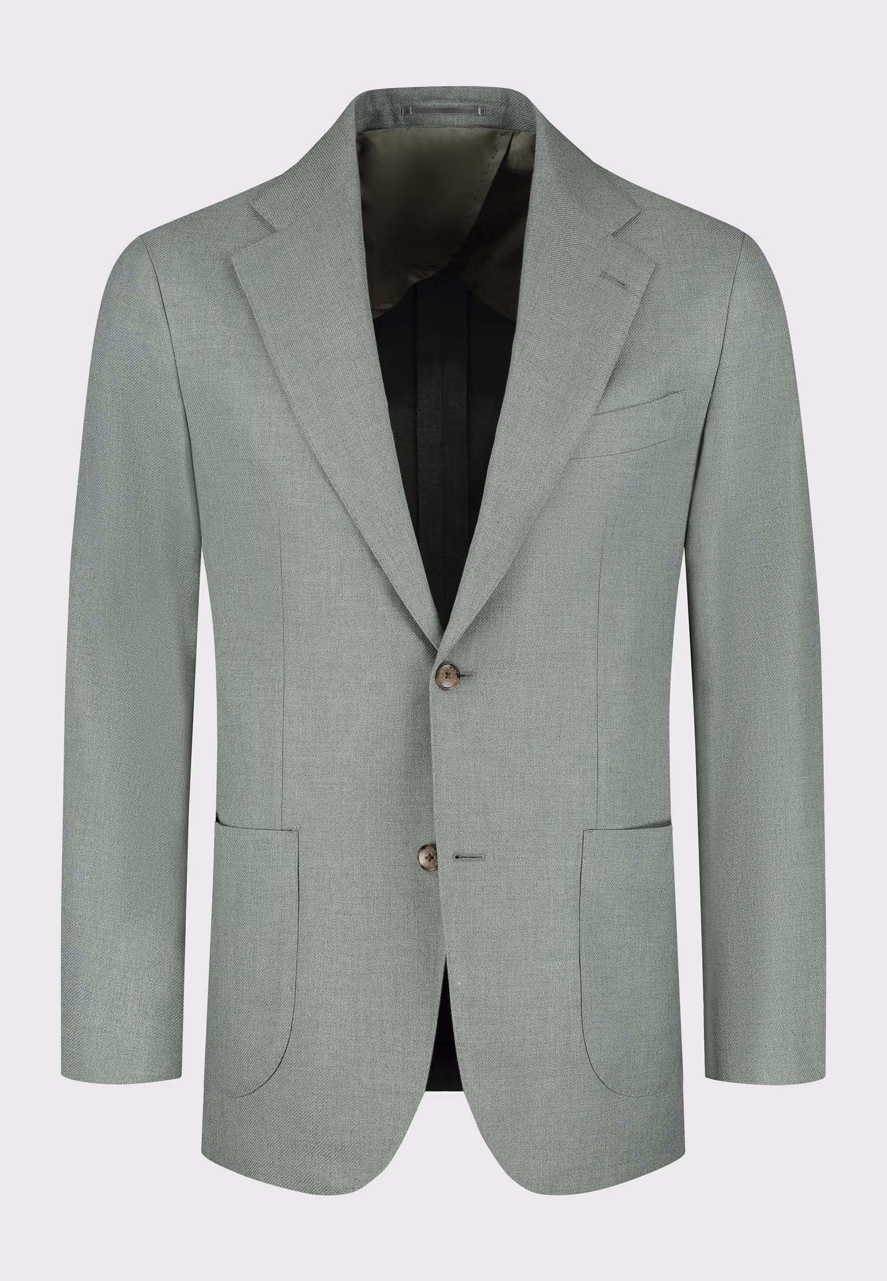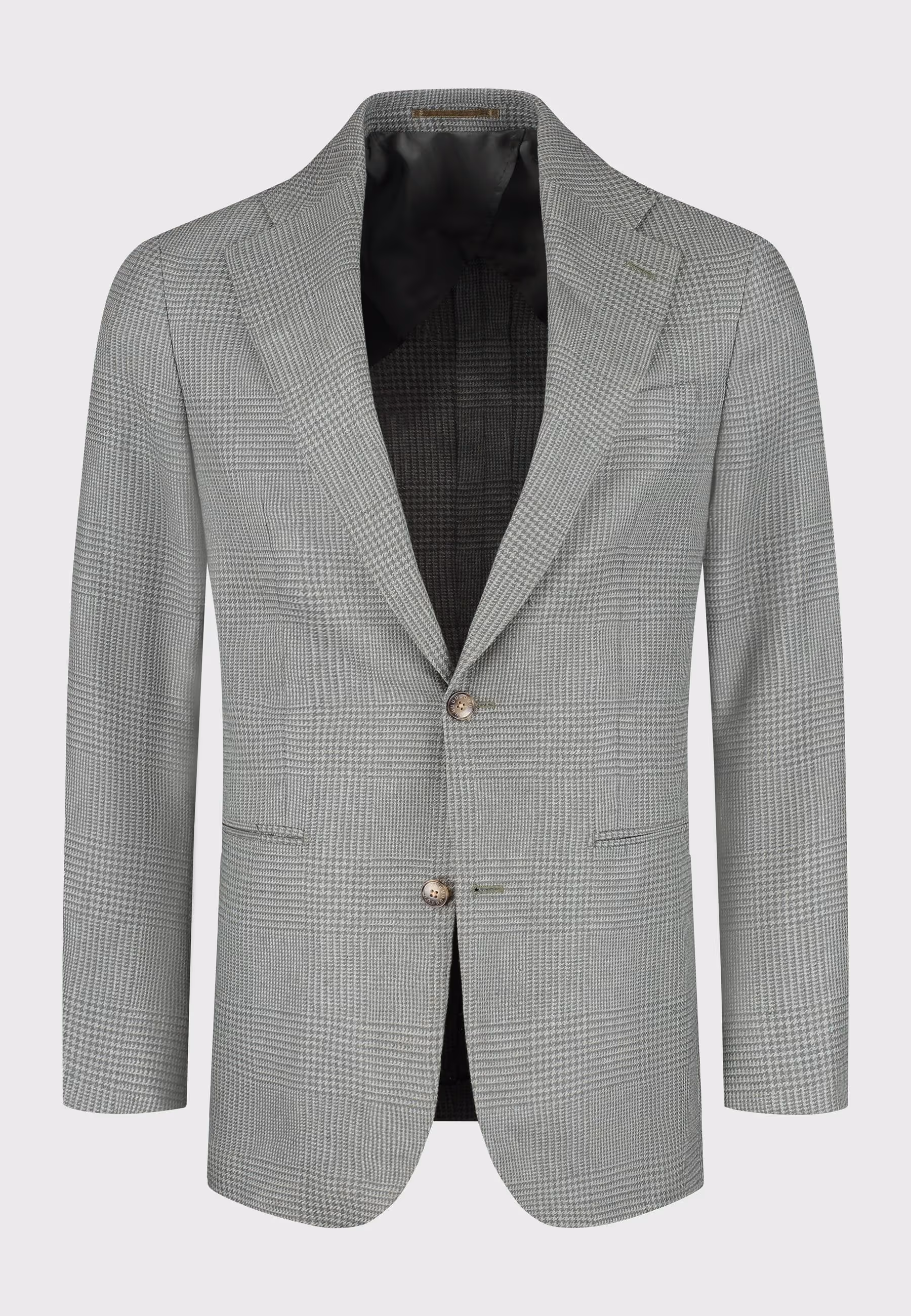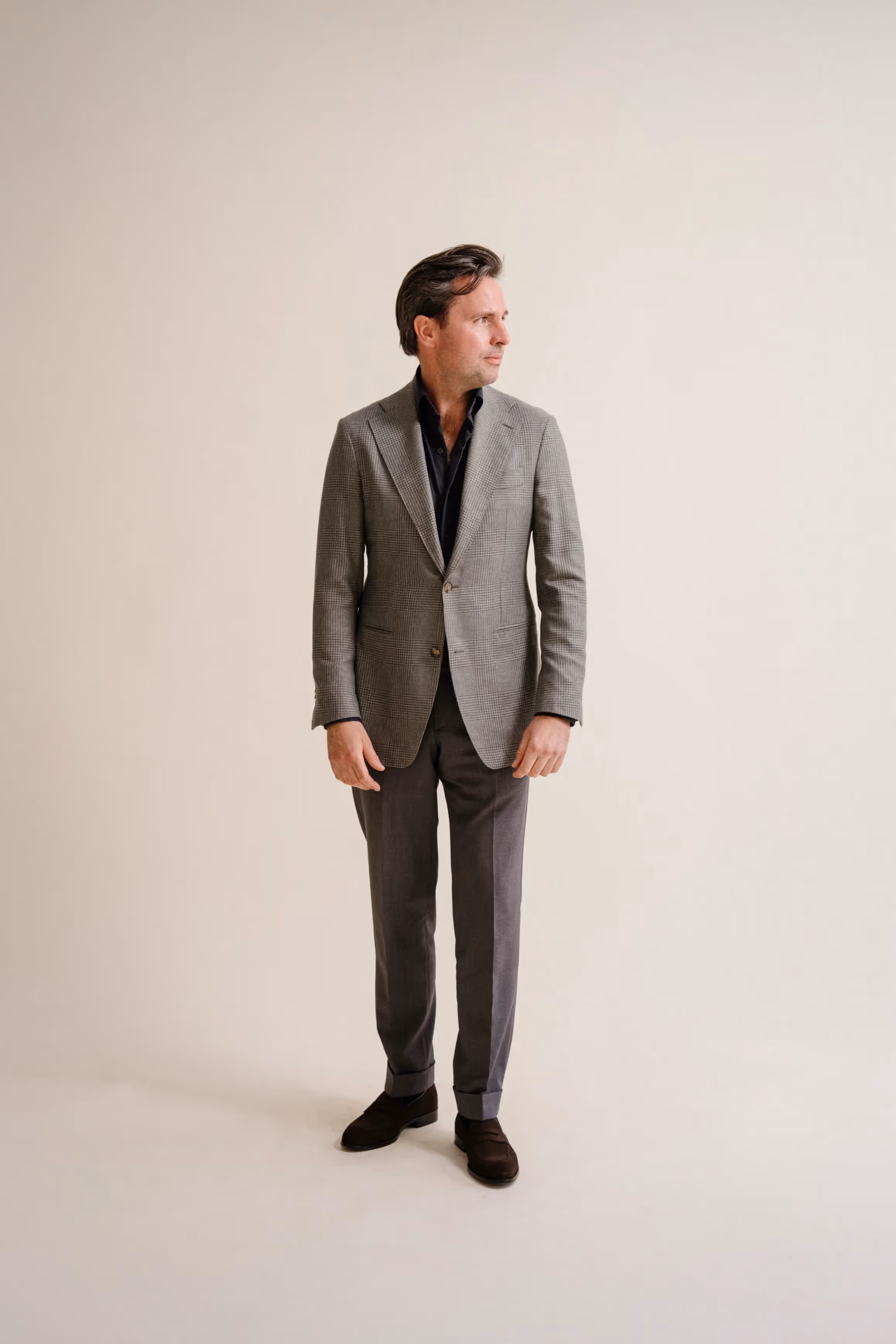 A green checked silk jacket paired with grey fresco trousers and a dark green wool shirt. Finished with black penny loafers for a clean, tonal look.