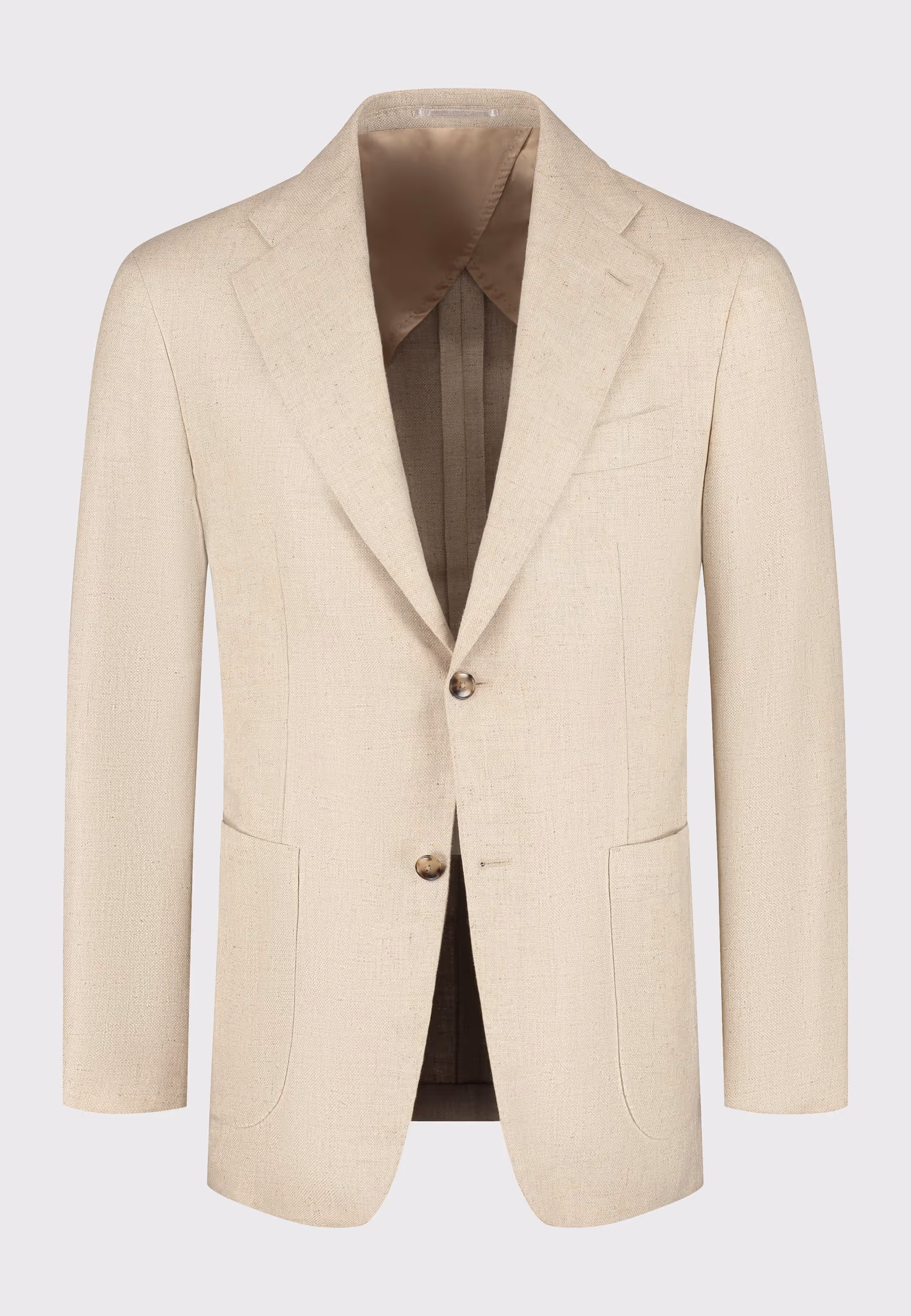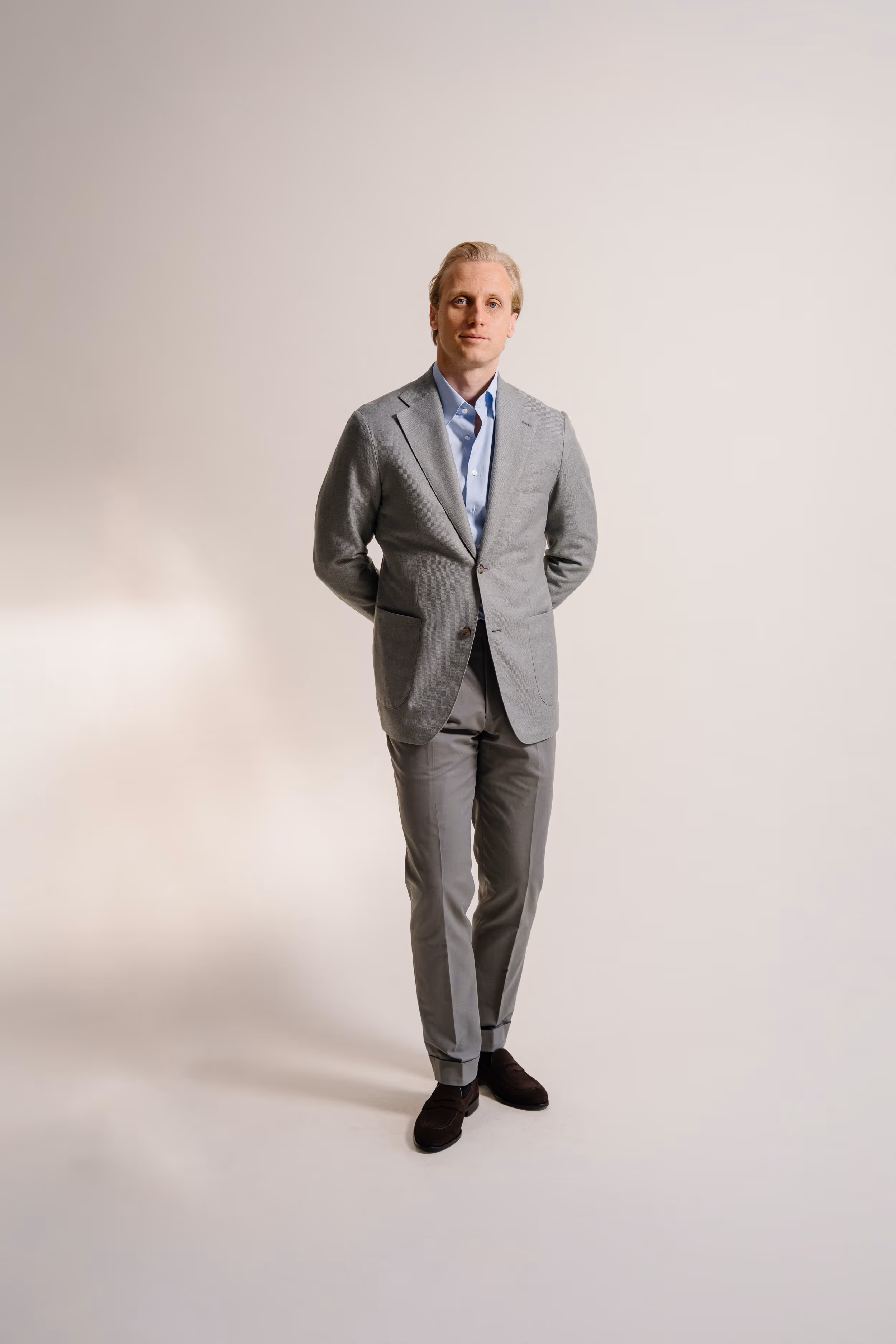 Light brown basket weave jacket, made from a wool/silk blend, paired with grey wool traveller trousers and suède brown penny loafers.