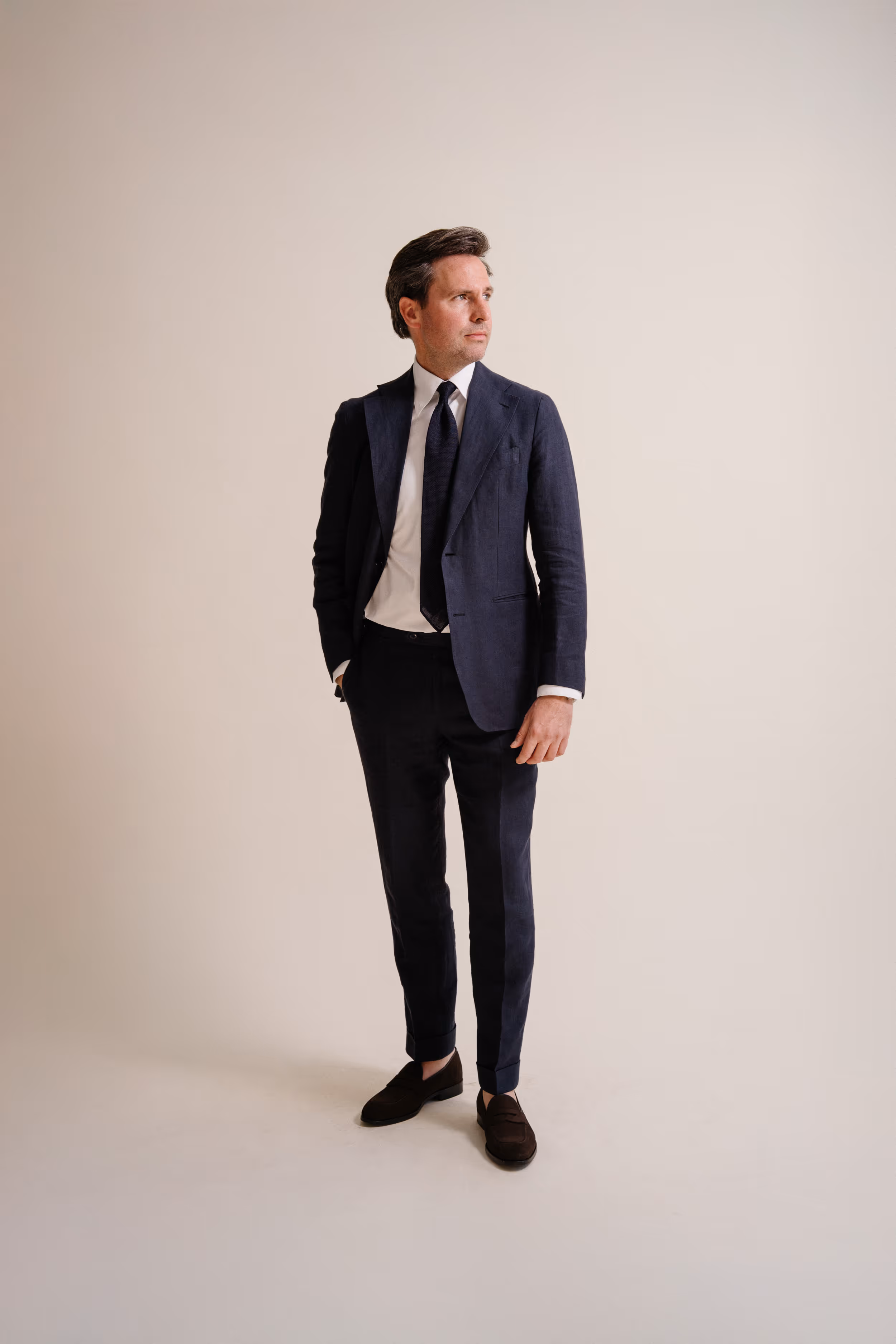 Classic navy linen suit, white shirt and navy shantung silk-linen tie. Paired with dark brown suède penny loafers.
