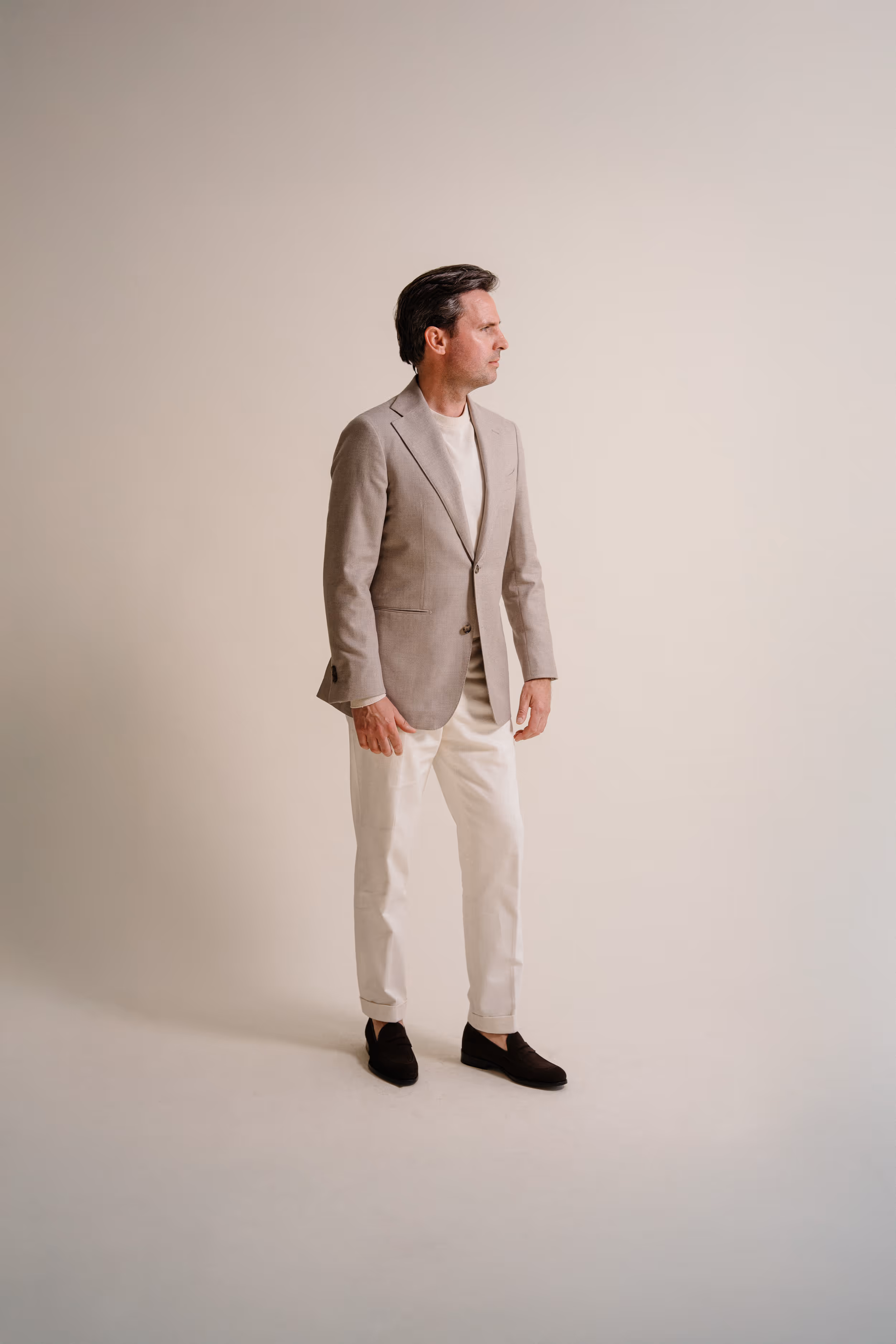 Sand-colored jacket from Loro Piana’s 'Cashpima' collection, paired with white cotton trousers and a white cotton-silk crew neck. Finished with dark brown suede loafers.