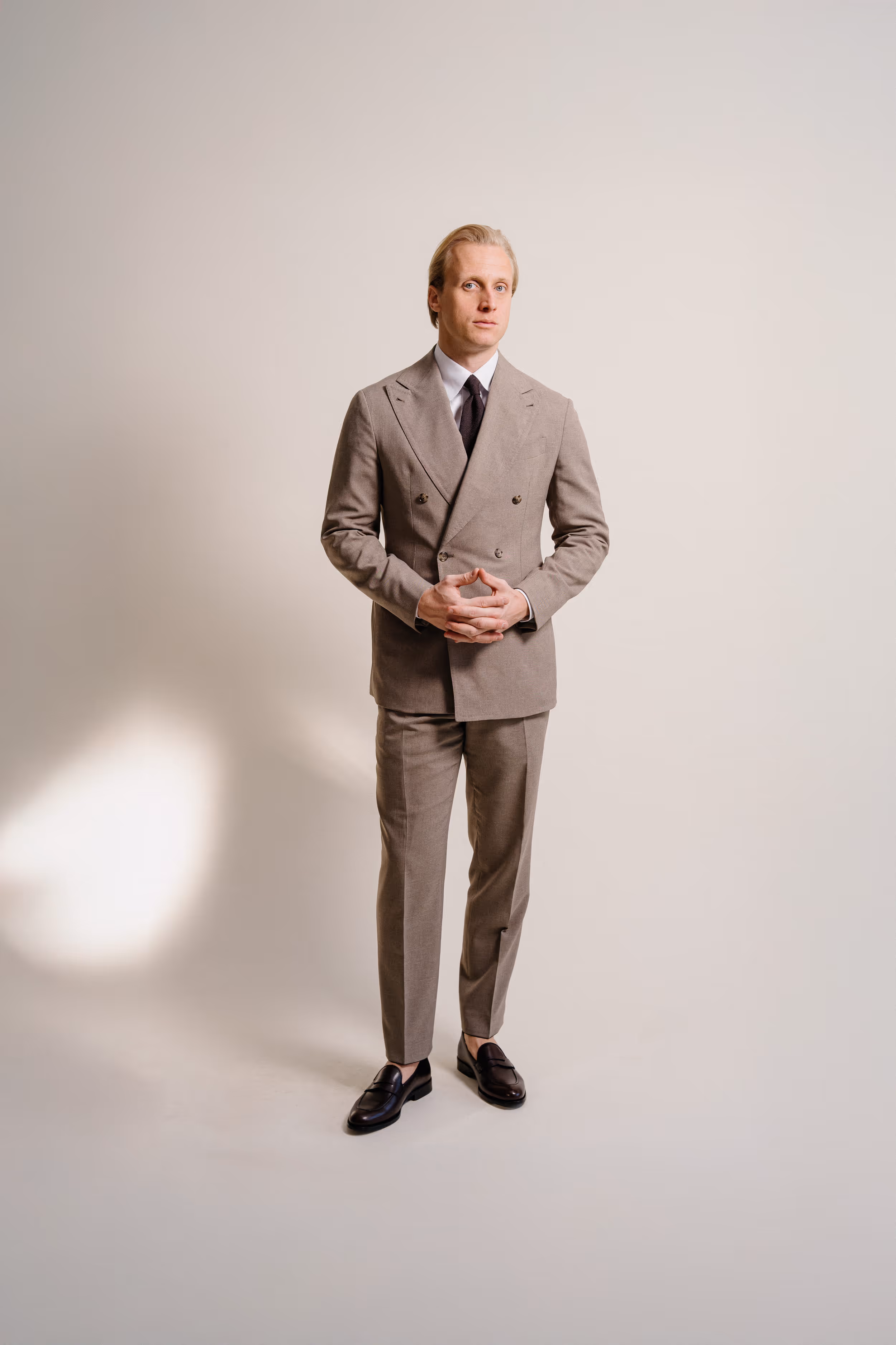 Soft brown double-breasted suit paired with a crisp white shirt and a brown shantung silk-linen tie. Finished with dark brown suede loafers for a refined, textured touch.