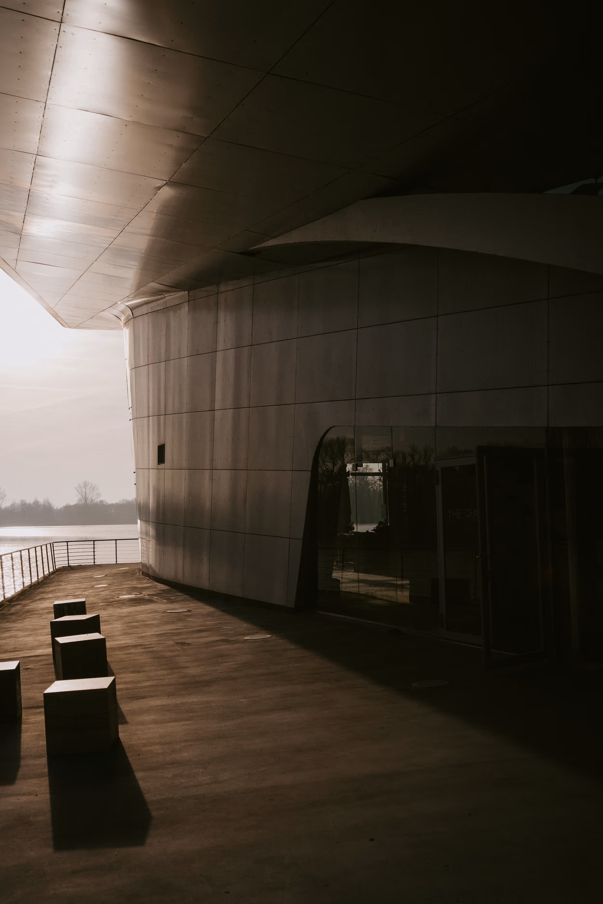 Originally built as the HydraPier for the Floriade of 2002, the pavilion was designed by Asymptote Architects. Two wing-like roofs hover above glass walls. Aluminium recalls aviation. Water flowing over the roof echoes the pumping stations that keep the polder dry. Technically advanced cold-bent glass made the structure forward-thinking at the time, earning it the AIA New York Design Award in 2003.