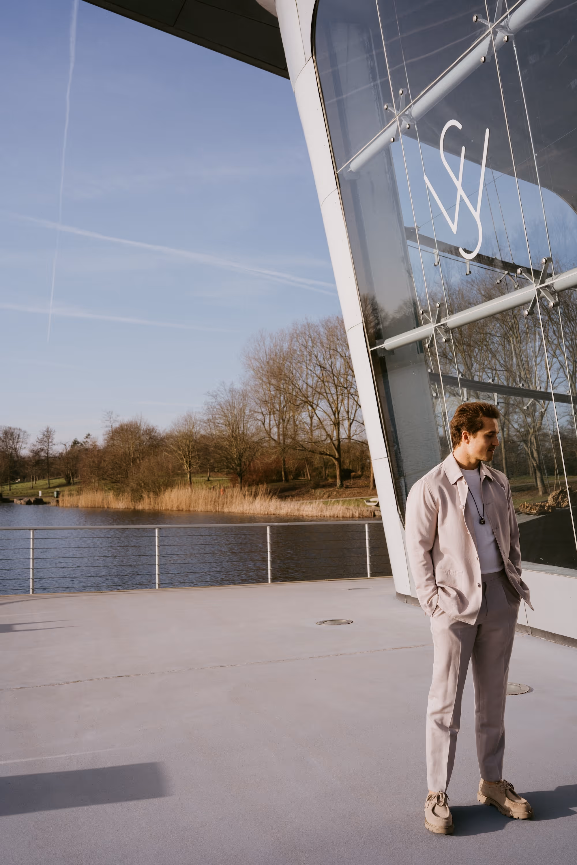 He often wears his own jewellery, not as adornment but as an extension of his work. In clothing, material and fit come first. Things must look right and feel right on the body. That is why he feels aligned with NASSAU. The compositions, the fabrics, the fabric-covered buttons on the utility suit. Nothing loud, everything considered.