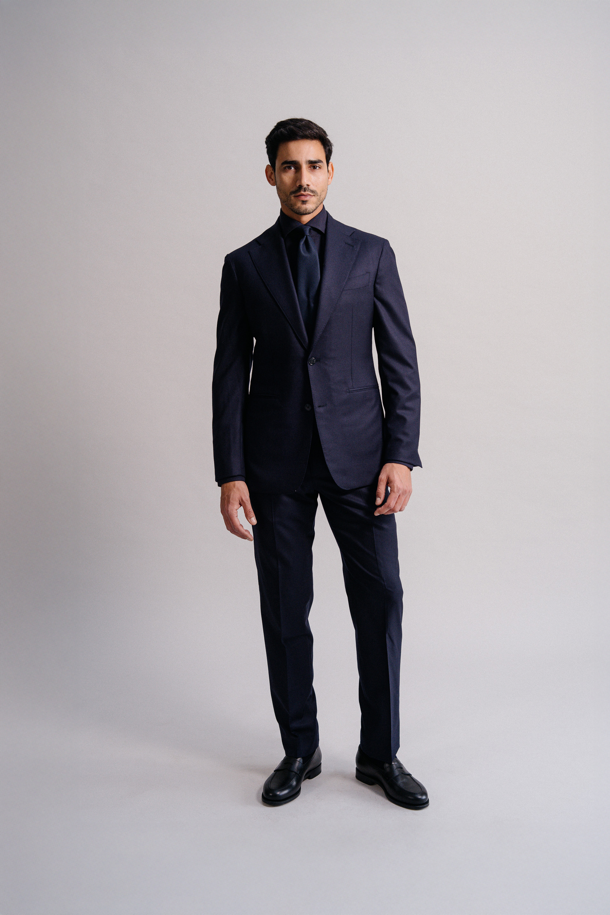'Tonal navy look' van top tot teen: een flannel pak, een wollen shirt en een das van 100% zijde. Verfijnd en klaar voor de avond, perfect voor cocktails en meer.